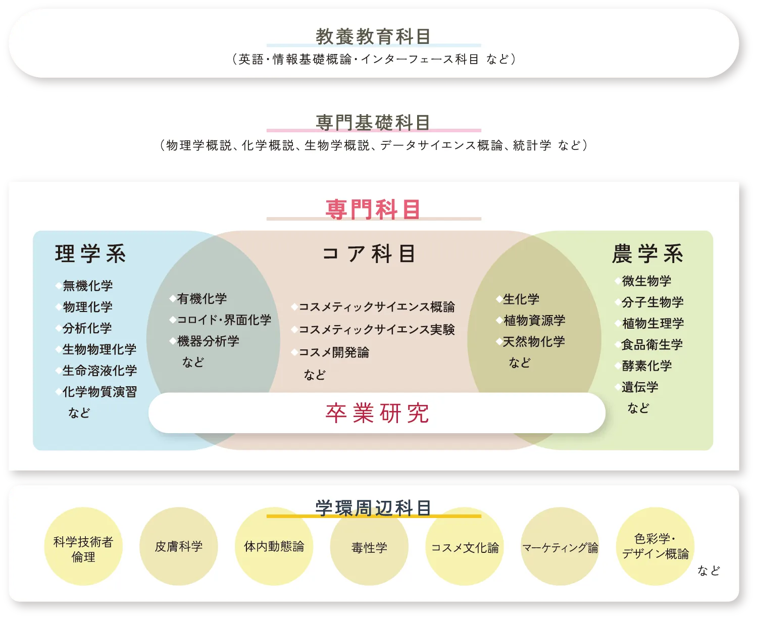 コスメティックサイエンス学環の教育は、理工学部・農学部を連携協力学部に持つ教育組織で、理工学部・農学部の教員組織や施設設備といった教育リソースを活用し、学部の枠にとらわれない横断的な教育が行われることが特徴です。